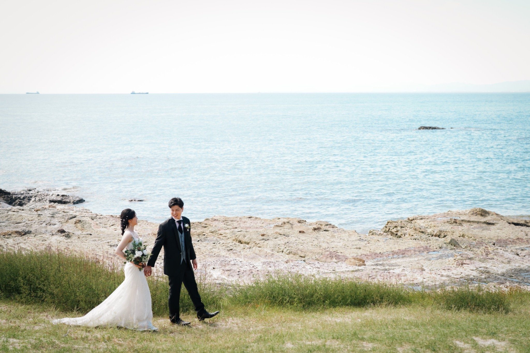 野間灯台を背景にした撮影は、この場所ならではの特別な一枚に。 長年海を見守ってきた灯台の姿は、これから人生を共に歩むおふたりの未来を象徴するような存在にも感じられます。 真っ白な灯台と広がる空、そして寄り添うふたりの姿が重なれば、まるで旅立ちの瞬間を祝福しているかのような情景に。 撮影を通して、野間灯台が単なるロケ地ではなく、おふたりの新たな思い出の場所となることでしょう。