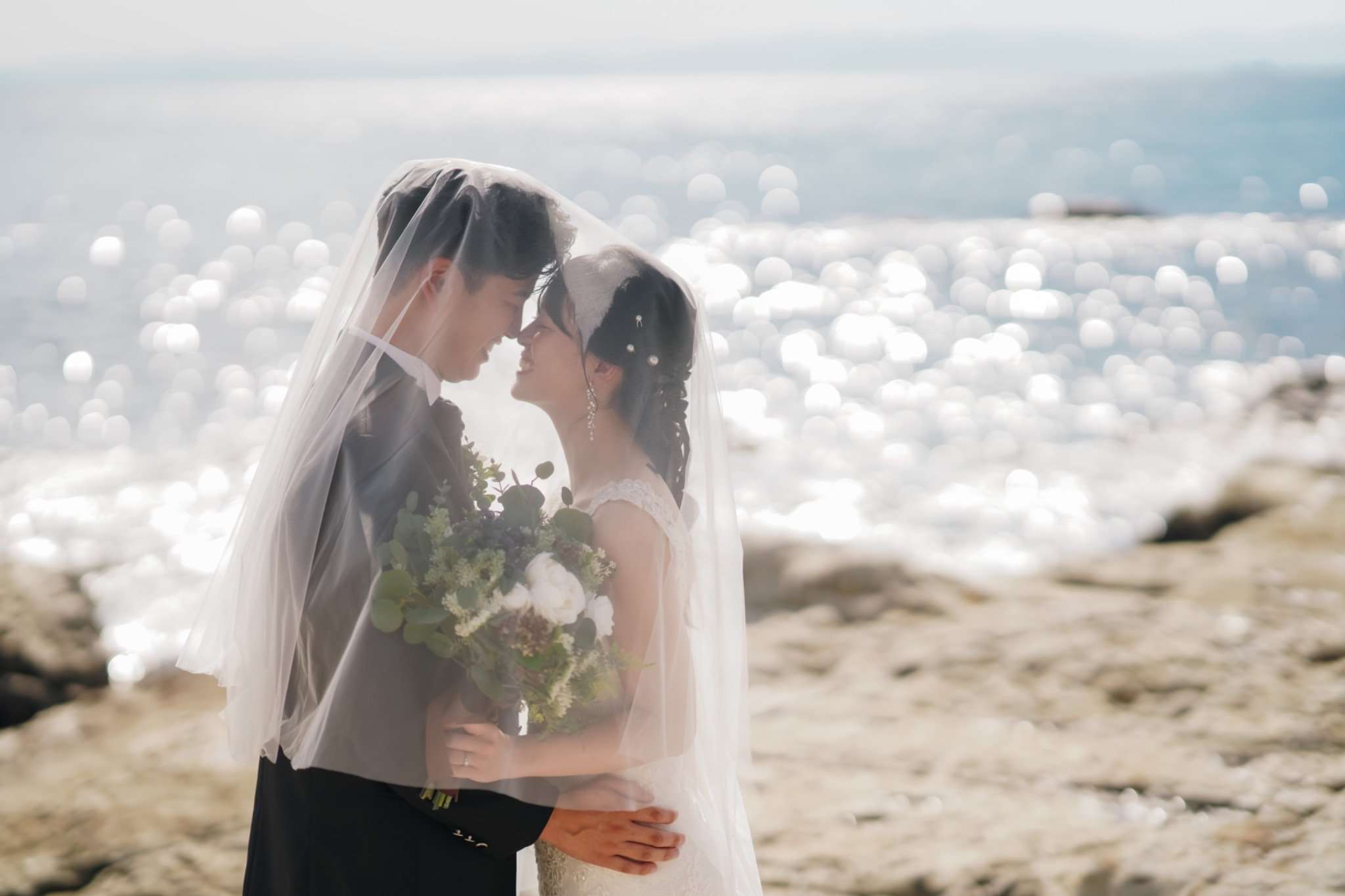 野間灯台の撮影で特に人気なのが、海風を活かしたベールの舞うショット。自然の風がやわらかくベールを揺らし、まるで映画のワンシーンのようなドラマティックな1枚に仕上がります。 特に、夕日や青空を背景にしたベールショットはリクエスト数No.1の定番カット。 風の強さや角度を見ながらヘアメイクスタッフやカメラマンがサポートするので、安心して撮影に臨めます。 野間灯台ならではの海風が生み出す動きのある写真は、他のロケーションではなかなか撮れない特別なカット。訪れたらぜひ残しておきたい、思い出深い1枚になります。