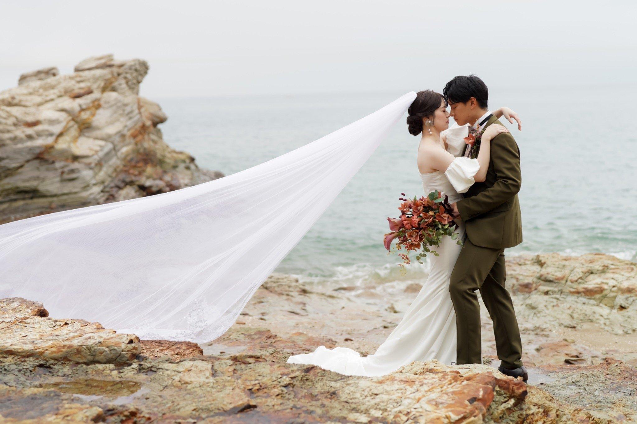 灯台周辺の岩場やコンクリートの壁面など、海辺らしい無機質でクールな背景を活かした撮影も可能です。 ロマンチックな海辺のシーンとは一転、スタイリッシュで都会的な雰囲気を演出できるため、1つのロケーションで異なるテイストの写真を残せるのが大きな魅力です。 ウエディングドレスやタキシードのフォーマルな装いが、無骨な背景によってより引き立ち、印象的な1枚に。 「ナチュラルだけじゃなく、かっこいい写真も残したい!」というおふたりにぴったりのスポットです。