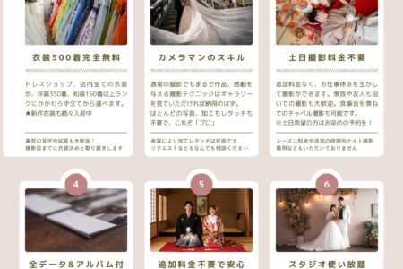 ・撮影小物使い放題 ・ブーケ15種選び放題 ・ベール 和傘