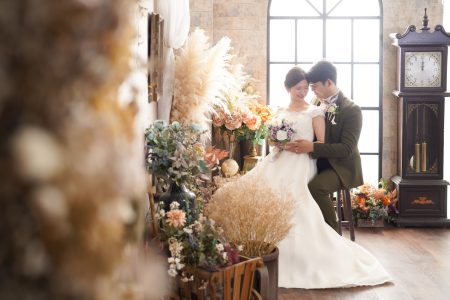 カルペディエムでは、お客様に料金の心配なく好きな衣装を選んでいただけるよう、全てのドレスとアクセサリーを無料で提供しています。最新トレンドからアンティークまで、幅広いスタイルの衣装を取り揃えており、専属スタッフが一緒になってお客様の理想に合う一着を見つけるお手伝いをします。撮影当日は、スタイリストと共にドレスに合わせたイヤリングなどの小物も選べます。お客様が満足のいく衣装選びをサポートします。